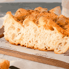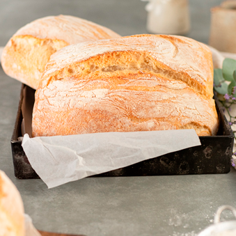 Crocante por fora, com miolo macio e produzido a partir de uma fermentação lenta. Combina com vários tipos de antepastos, conservas, patês, mousses e terrine.