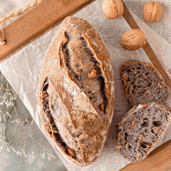 Um pão com uma casca crocante, massa leve e um miolo úmido. Possui uma cor roxa característica desse pão com recheio de nozes super gostoso. Preparado no processo natural au levain que leva 30 horas de fermentação.
